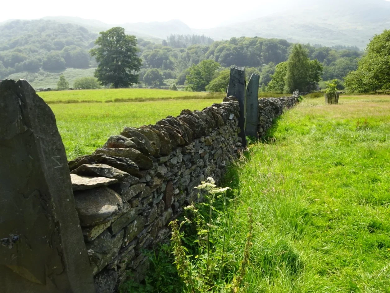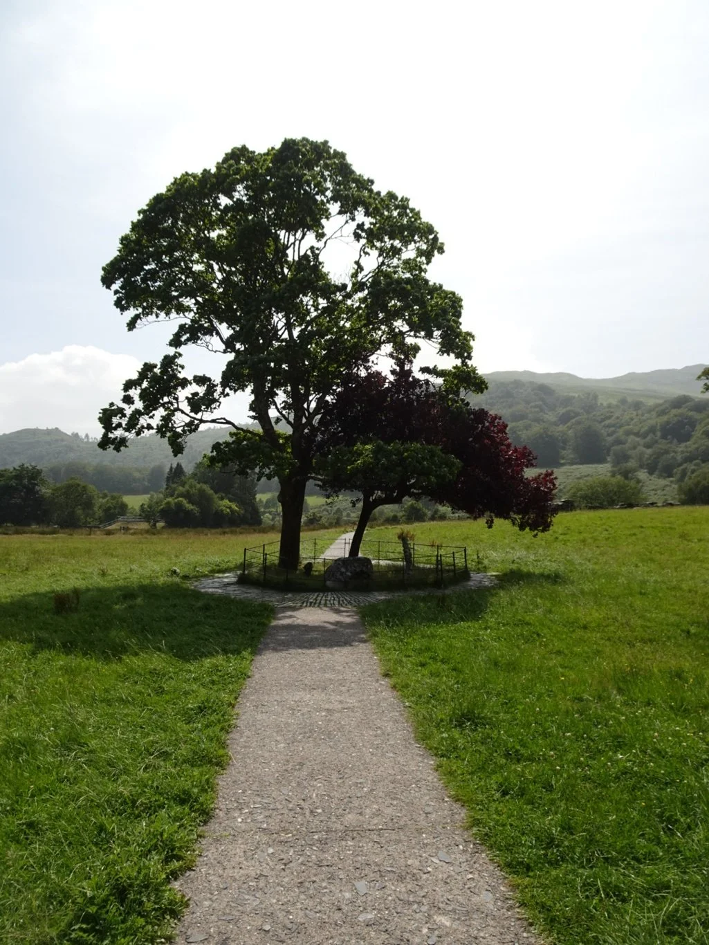 Back to Gelert, though. Walking across a field from the centre of the village, following a well-trodden pathway that became a proper footpath once we'd squeezed through an opening in the wall, we came across a shady spot beneath two trees, protected by a fence.