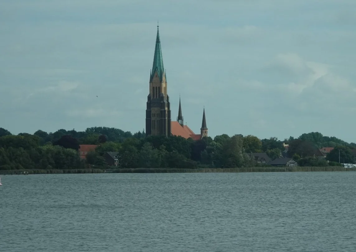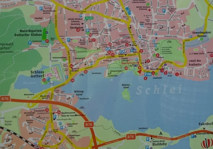 It wasn't far from there to Schleswig, somewhere we'd planned to stop for a while and take a break. It'd be our last stop in Germany for a while and there were a couple of things I'd hoped to get from a supermarket along the way. I'd been watching out for one on the right side of the road, with plenty of parking and easy access, where I could simply dive in and get what I wanted in minimum time. As we passed the cathedral there on the other side of the water, my Hero and I were chatting about something, I was looking out for a supermarket and we were zipping along in busy traffic looking out for the turning into the city at the same time.