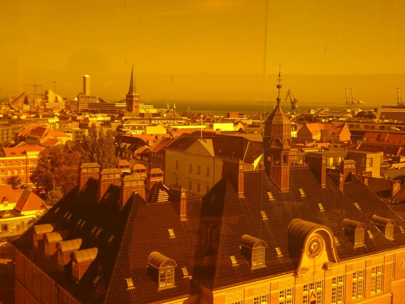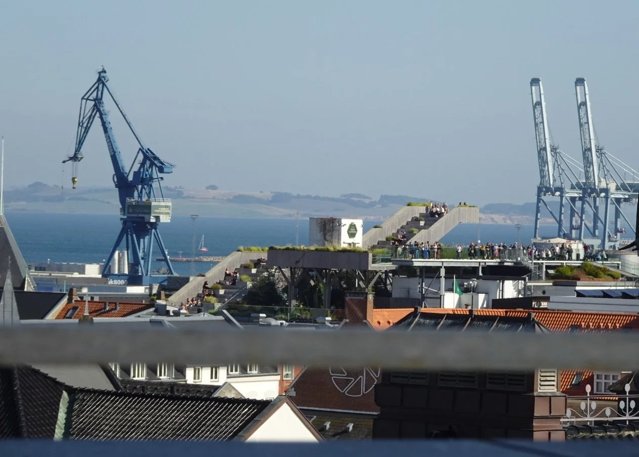The floor immediately beneath the Rainbow panorama was a roof terrace and I have no need to say what a relief that first breath of fresh air was after the heat of the walkway. From here there were fabulous views of the city, to the port and to the bay beyond. We were intrigued by those steps, which we later discovered to be the Salling Roof garden and viewing platform.