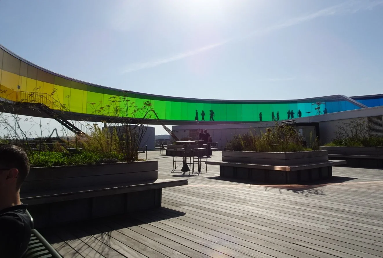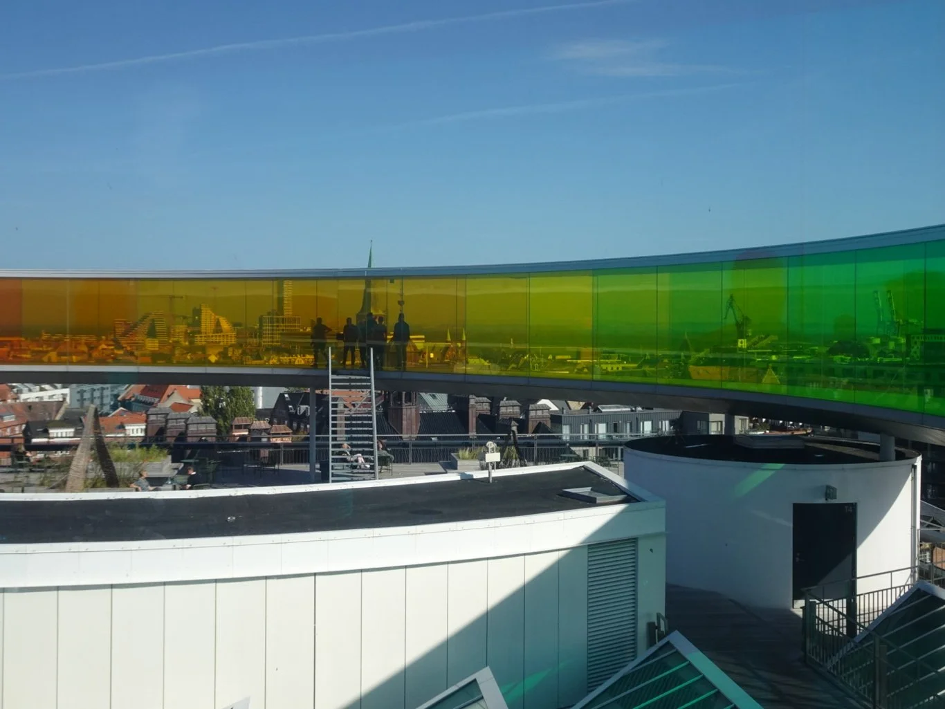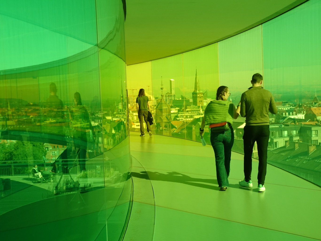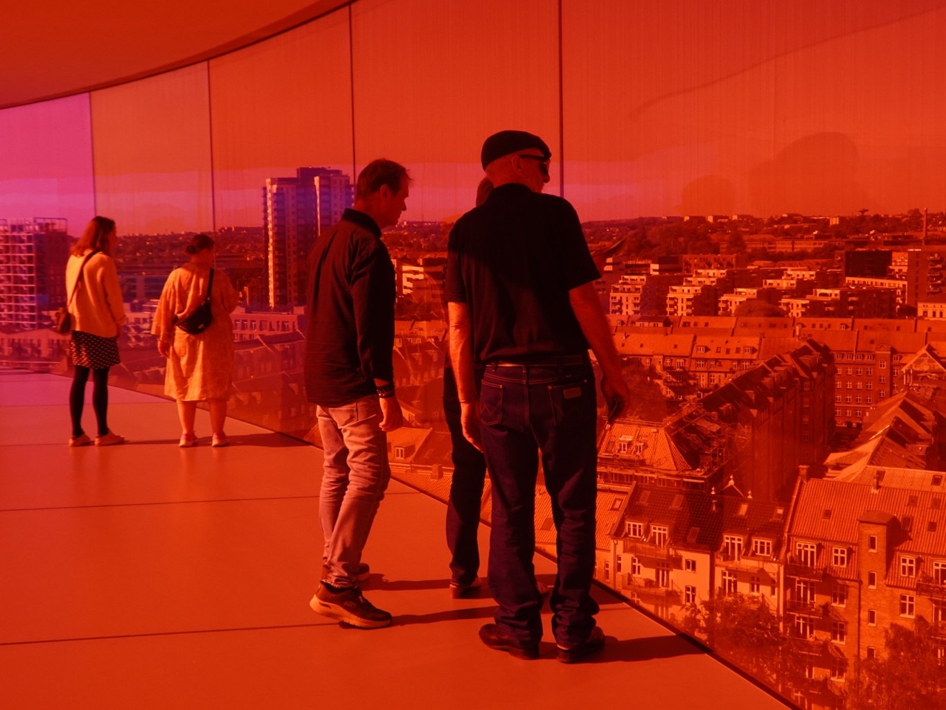 Tickets in hand, we headed up to the top to work our way down as we usually do, starting our tour at the artwork on the roof, entitled Your Rainbow Panorama, created by Olafur Eliasson in 2011. Another one of the city landmarks.
