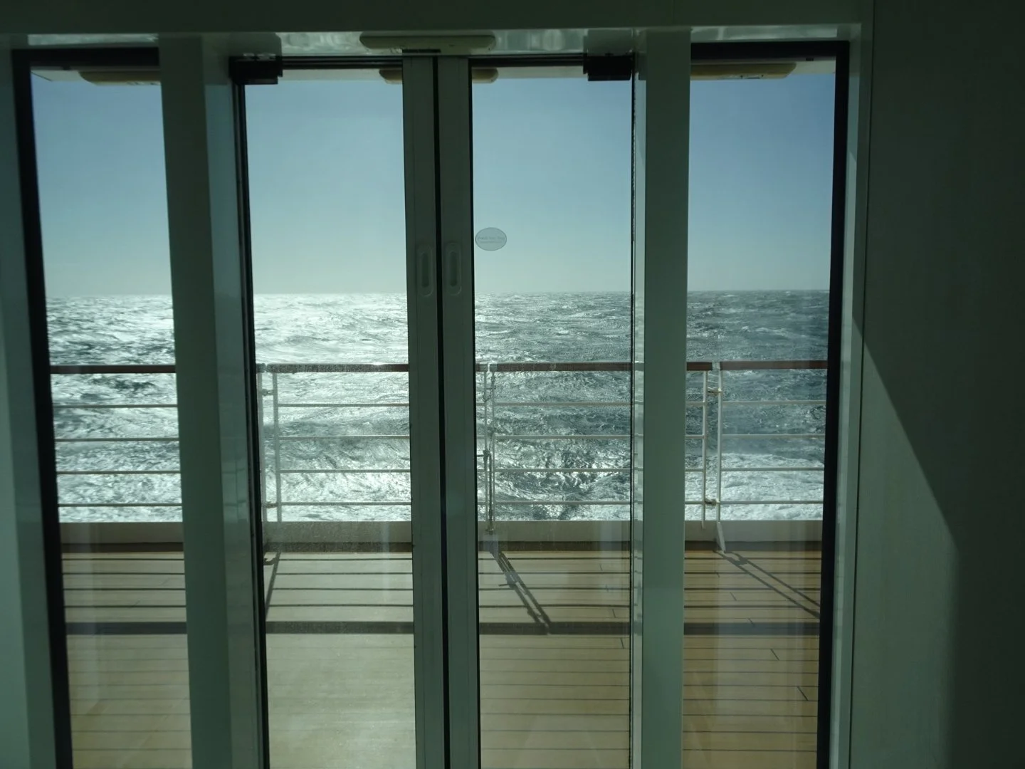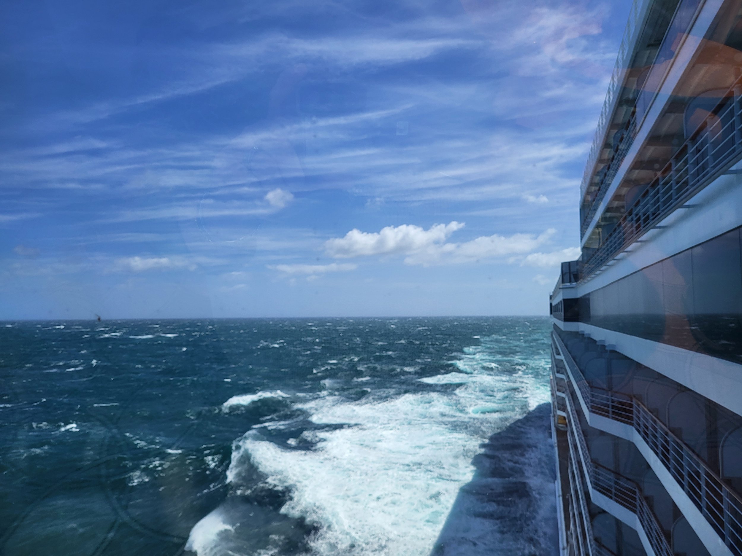 From high in the Observation Lounge, “up top”, we could see the waves crashing on the lower decks and were reminded that, as part of his initial warning, the Captain had said that some shutters would be applied to lower deck windows as a precaution.