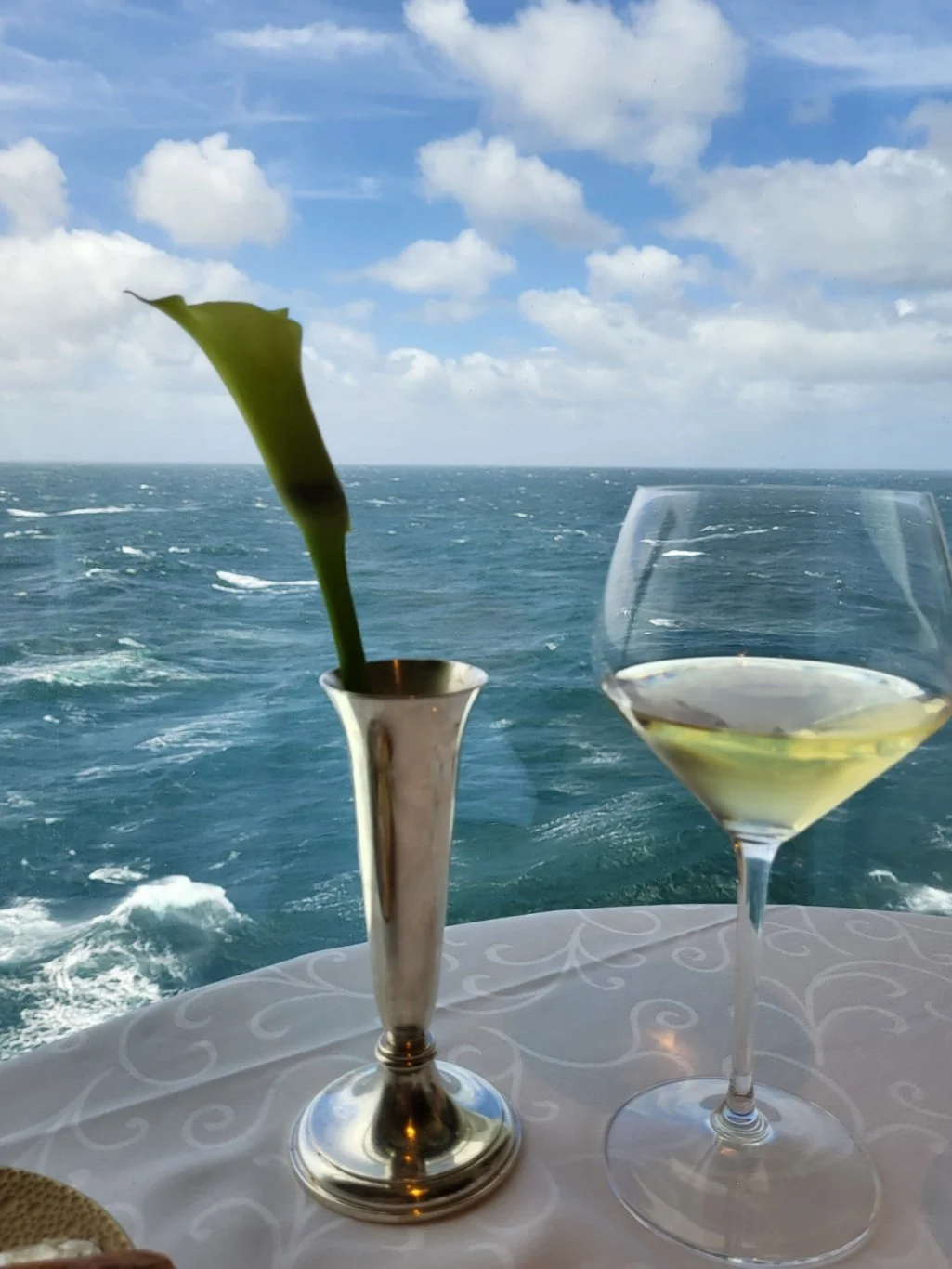 Actually, we rather enjoyed sitting watching the sea from this excellent viewpoint. Settled into a pair of solid, comfortable chairs which were not going anywhere, we watched the waves and felt thankful neither of us suffers from seasickness, because it was nearing lunchtime!
