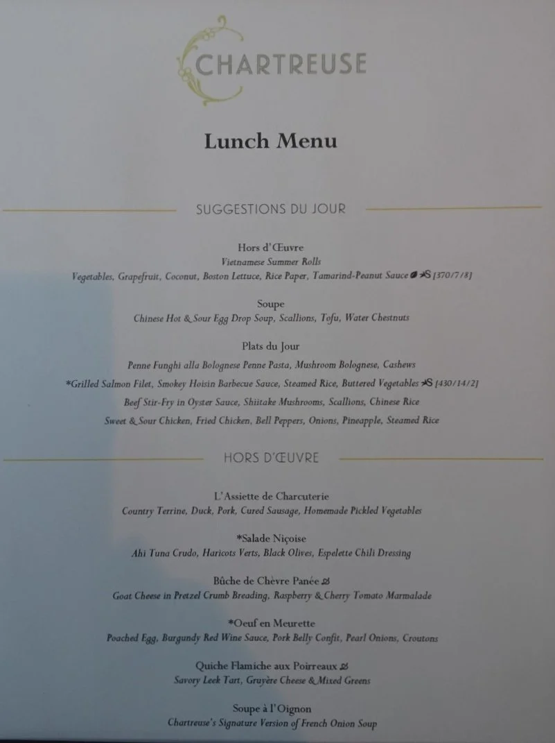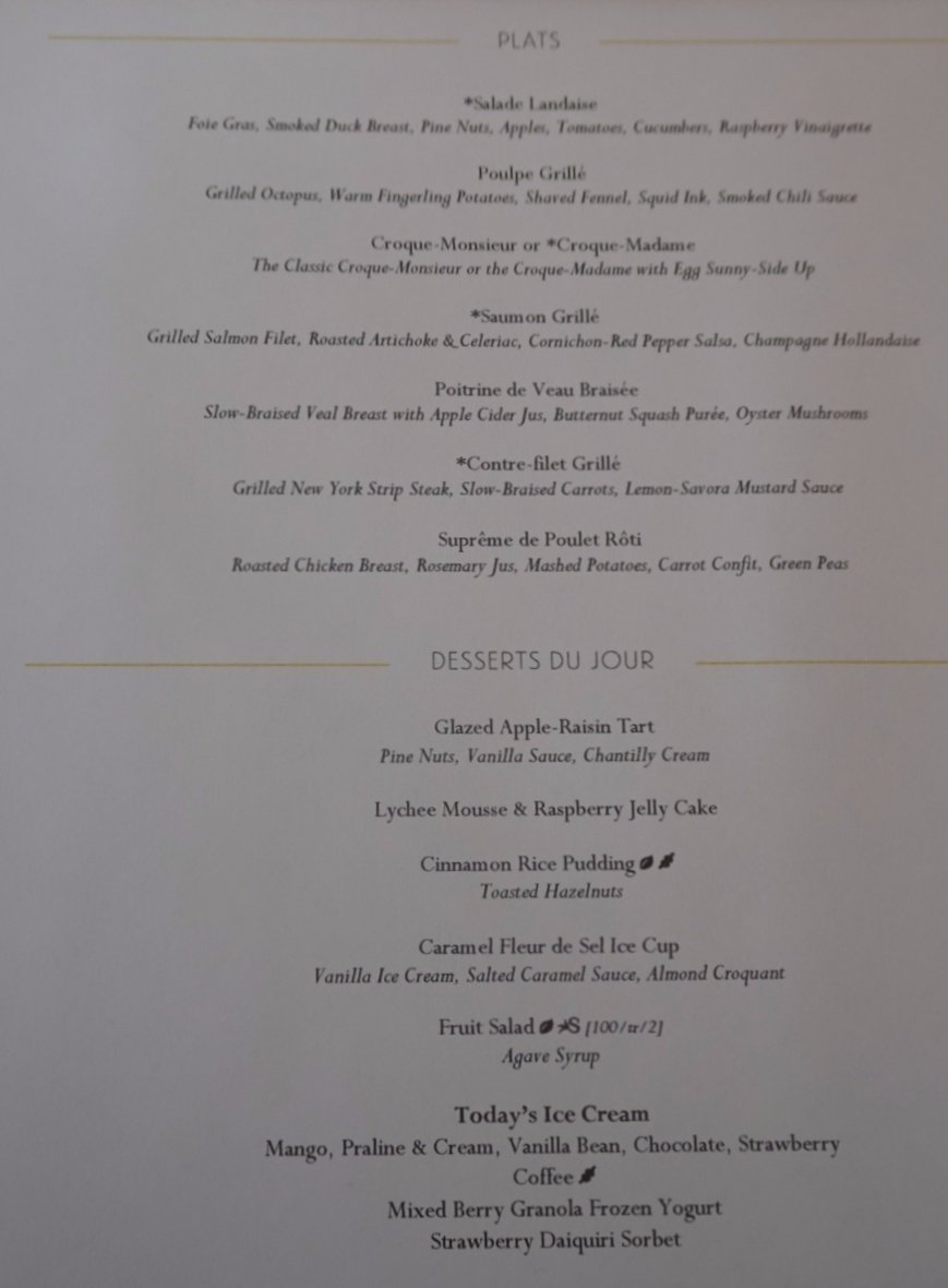 The French restaurant was open for lunch today and there were decisions to be made with the help of our delightful Peruvian server Claudia.
