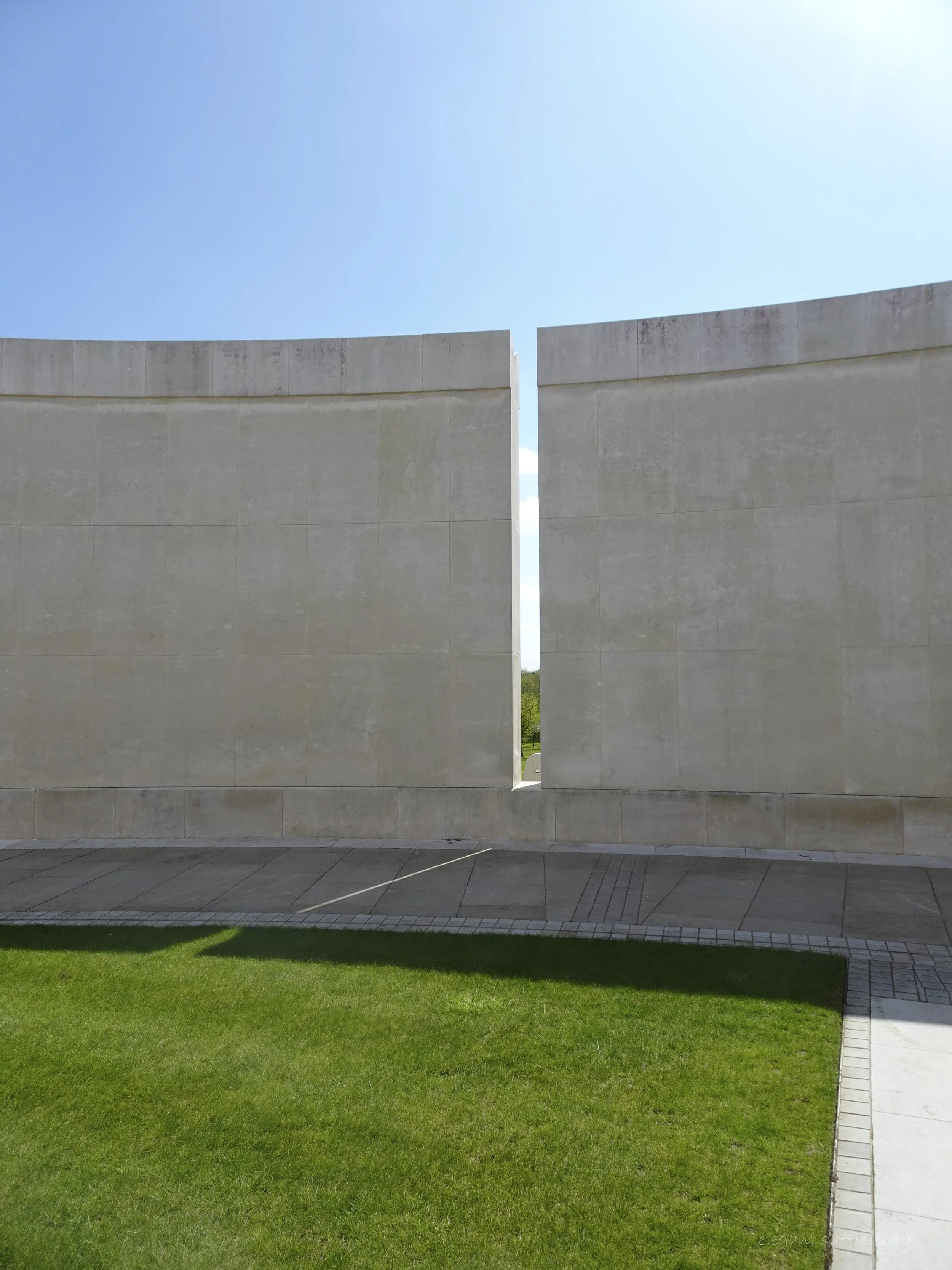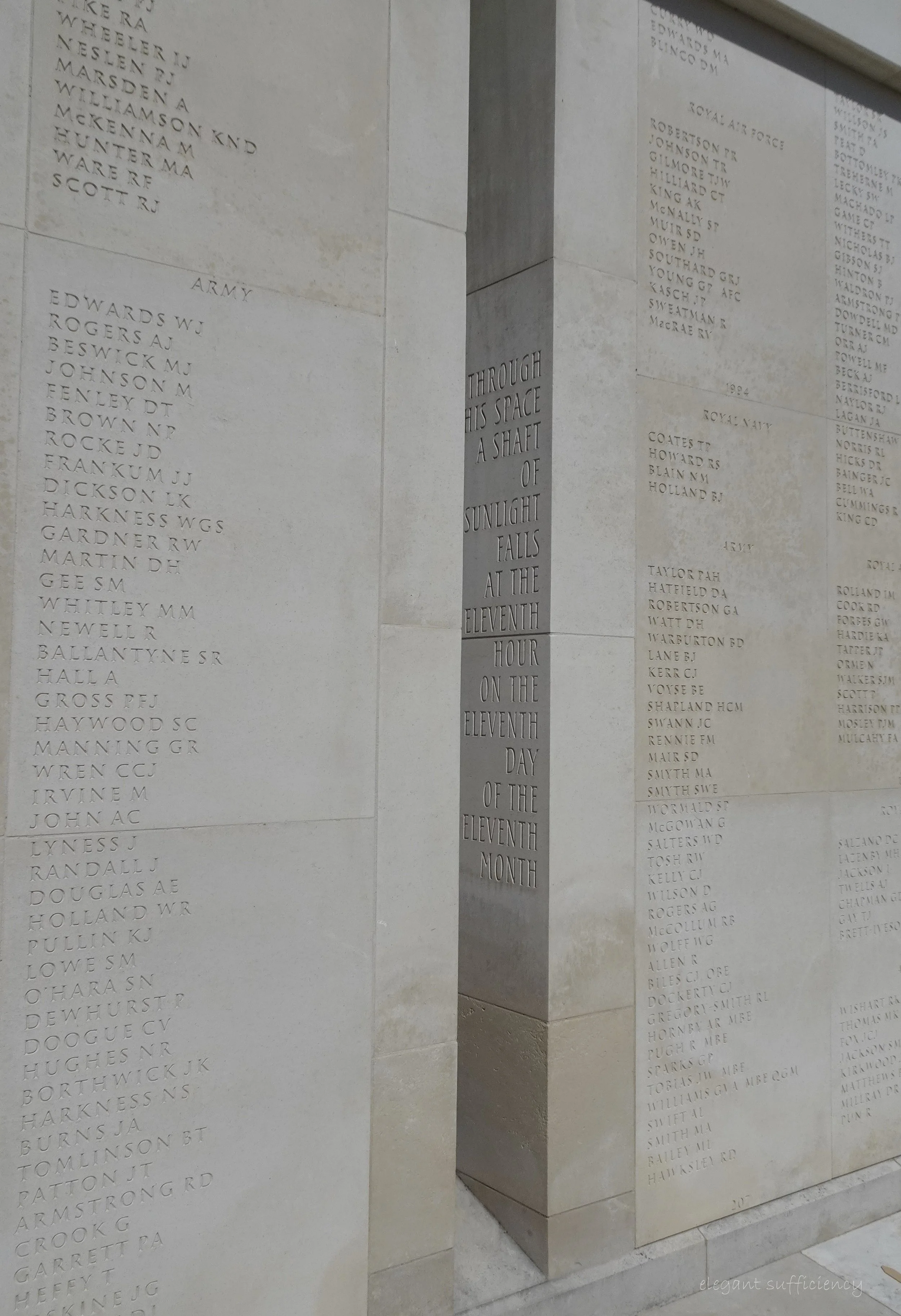 and this lines up with another gap on the inner wall opposite. On Armistice Day, the 11th of November, at 11 o’clock each year, the sun shines directly through those gaps and onto the bronze wreath in the central area. We’d seen news reports of the ceremony here and will appreciate them all the more having been here ourselves.