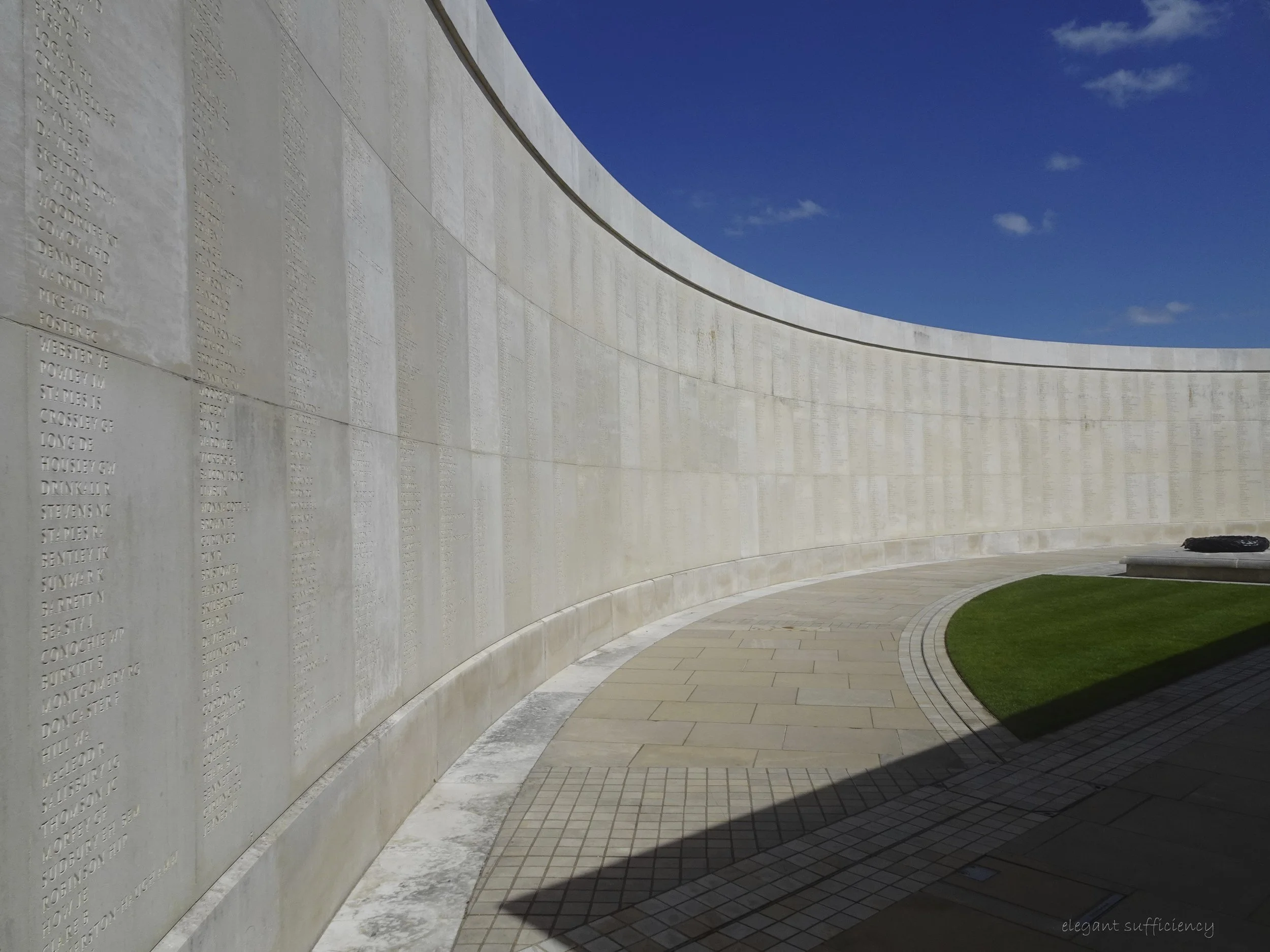 Three quarters of those two curved walls are covered in names, thankfully fewer in more recent years. The memorial was constructed to accommodate many more names, though, as my Hero observed as we stood quietly alongside, if only we could believe that space would never be needed.