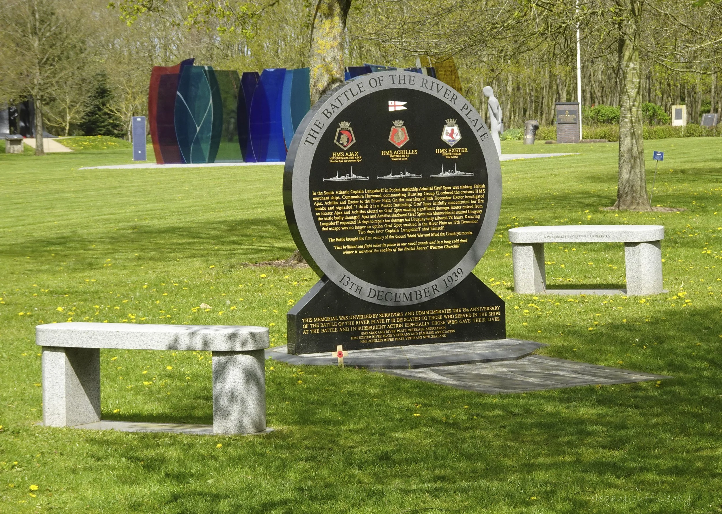And just nearby was the memorial to the Battle of the River Plate, which prompted memories of being on board a P&O ship many years ago, sailing between Buenos Aires and Montevideo and past the site of that battle, when the Captain flew the Union Jack and played the National Anthem. It’s also clearer in this picture how the memorials vary in style and substance. Some are immediately recognisable whereas others are designed in a more creative way, such as the colourful glass National Naval Memorial there in the background.