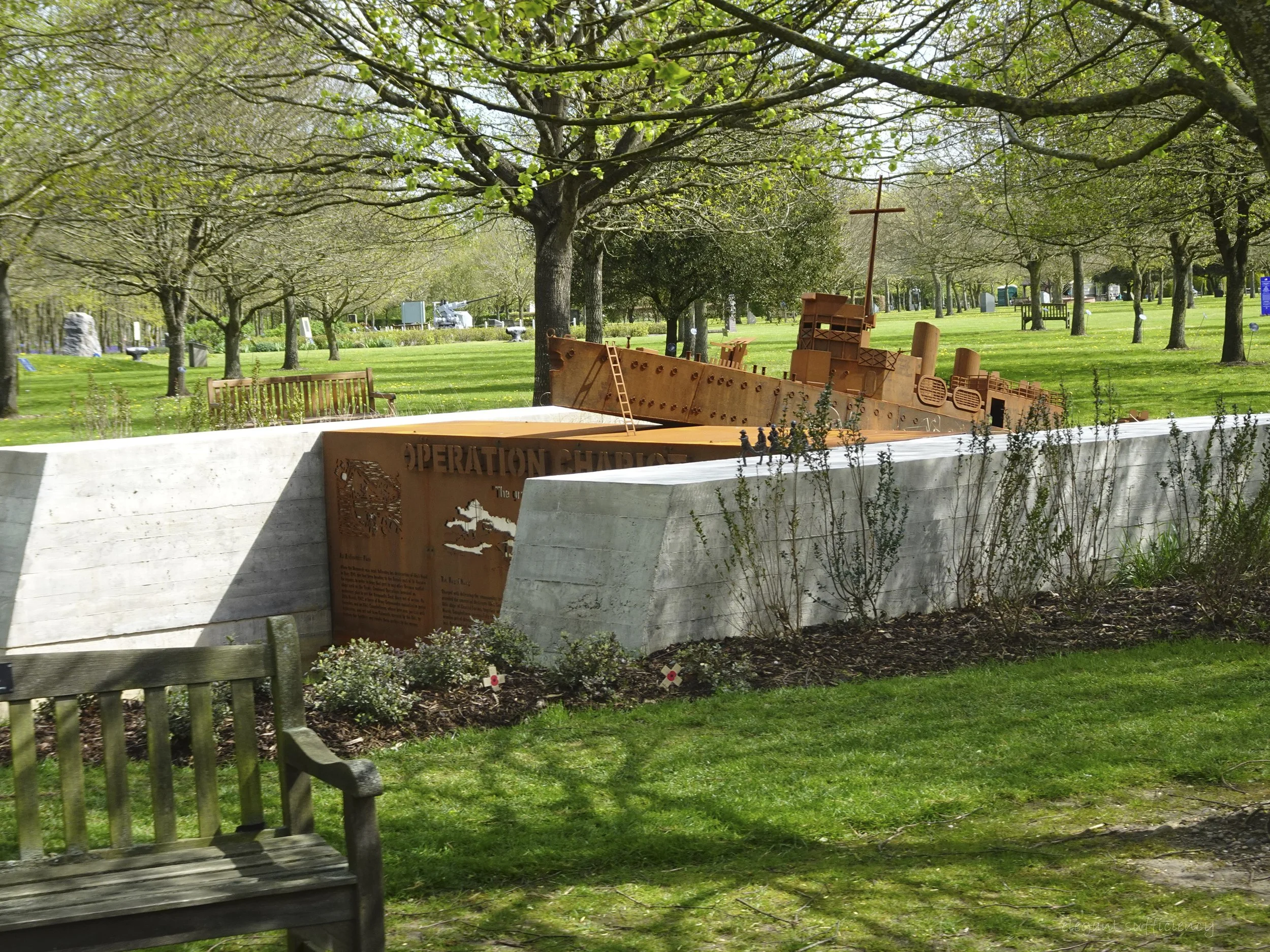 Taking photographs of the recently installed Operation Chariot memorial from a moving vehicle, however slowly it was creeping along, wasn’t easy and the angle was far from optimal. If only I could have missed that bench…