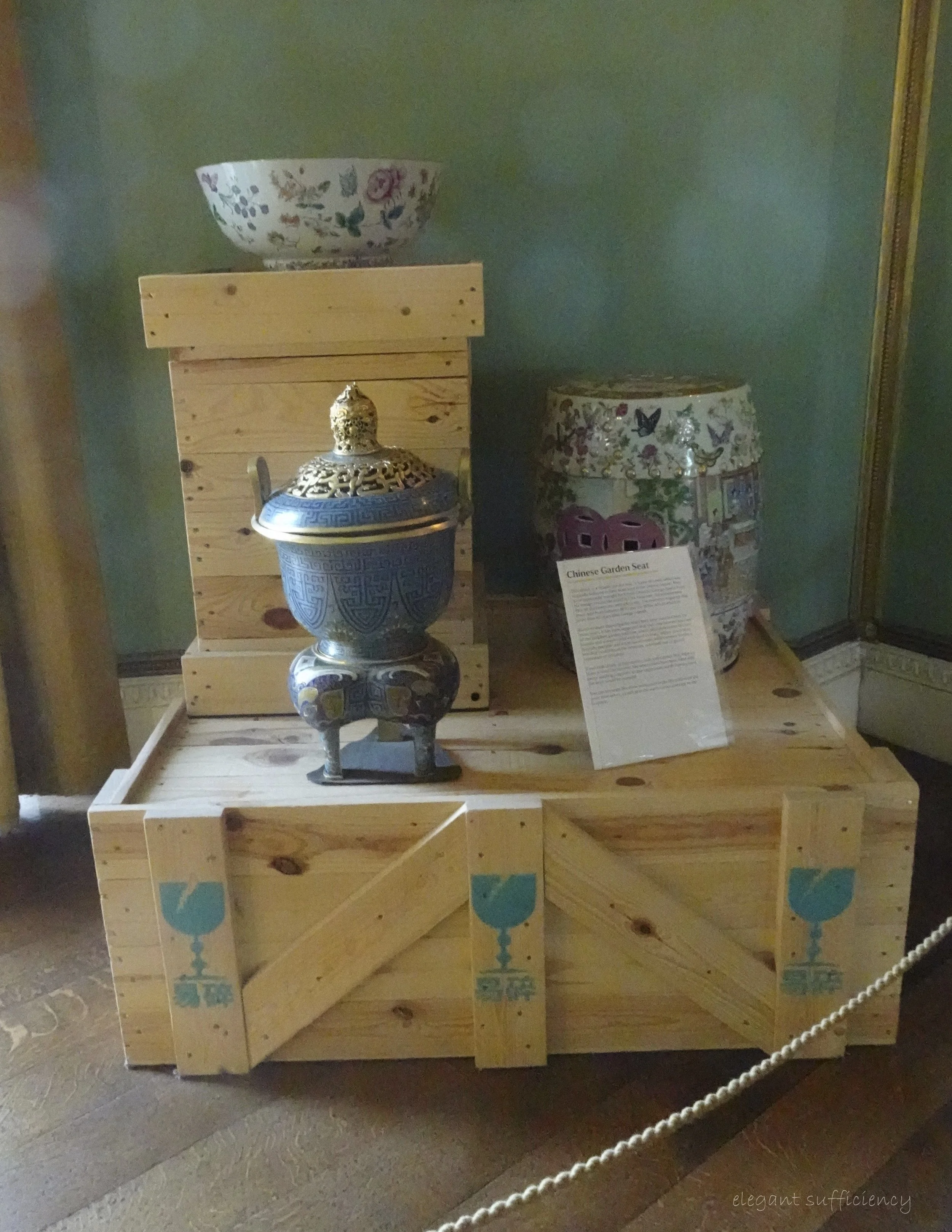 Moving on from the formal, state rooms, there followed a series of story-telling displays, each featuring several well chosen items which illustrated life in the Hall around the time of George and Thomas. The printed explanation on this staging refers to the “Chinese Garden Seat” behind it, which could be filled with sweet smelling herbs and flowers to “mask the odour of the sitter” 🫢