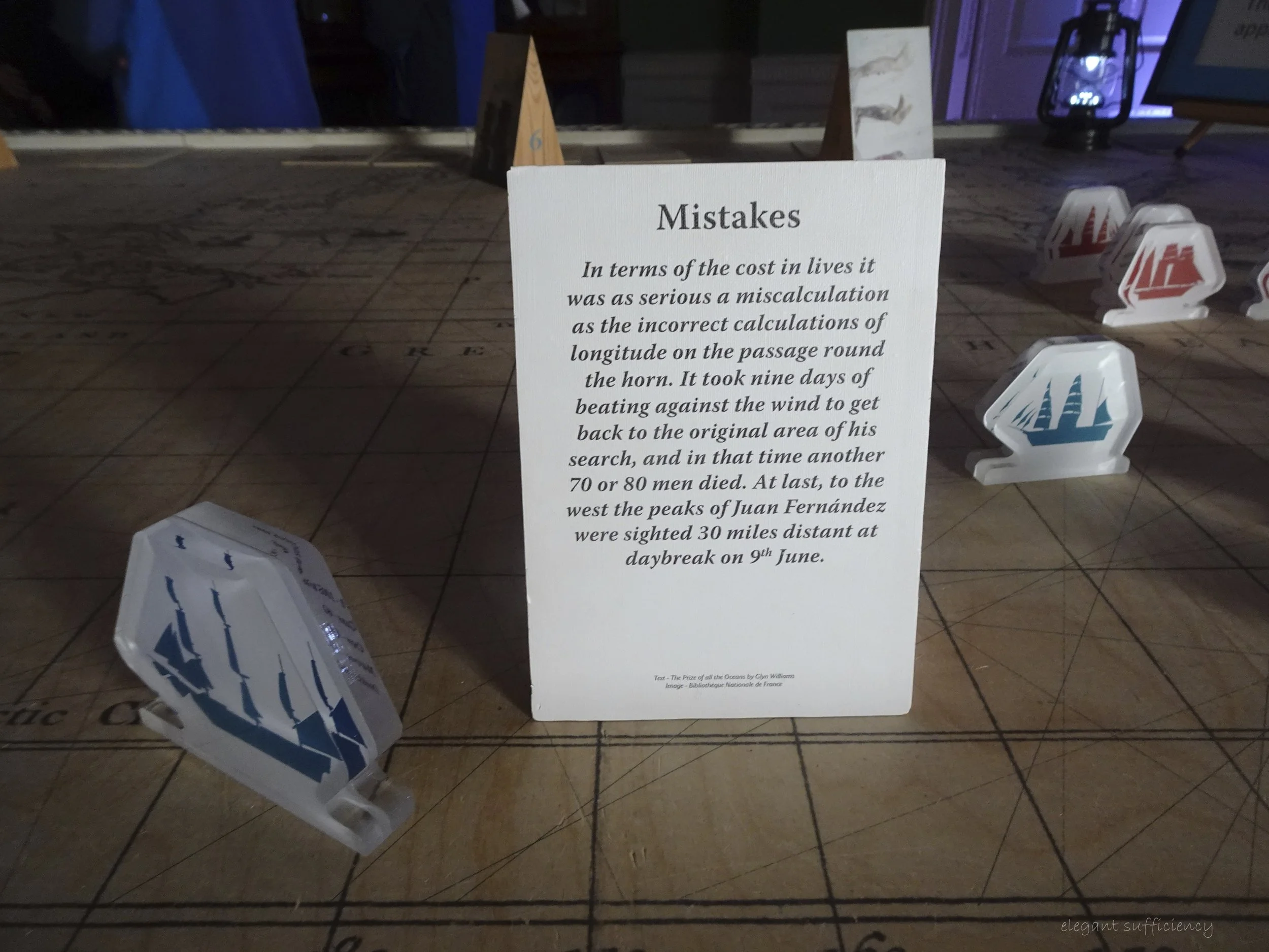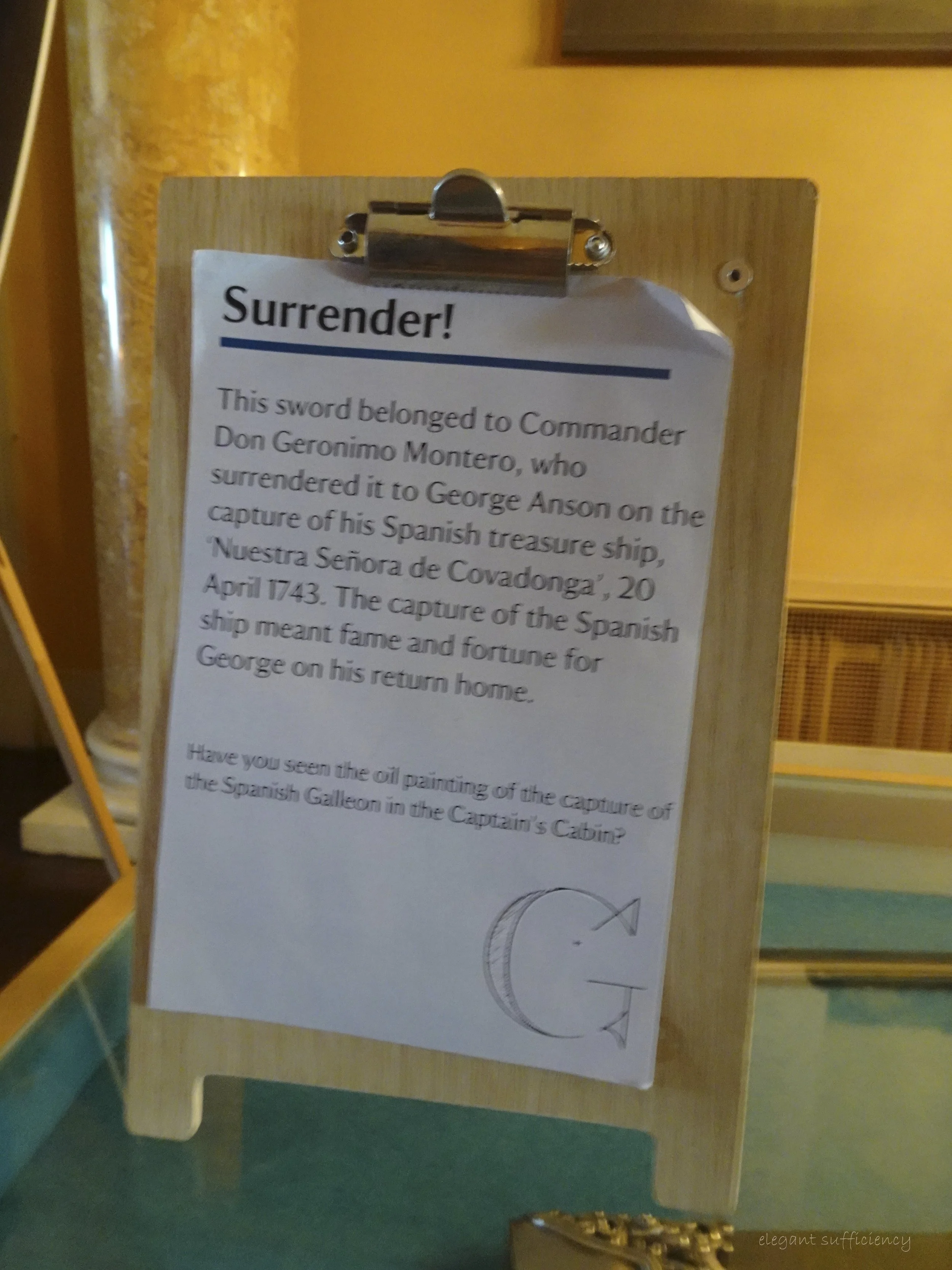 We were especially appreciative of the gentleman standing by the large map table in the next room, who explained the progress of George Anson’s circumnavigational voyage in 1741. The information was presented in several forms, the most effective being a timeline showing the number of men on each ship. Sadly, each of the lines representing the eight ships reflected the decline in numbers before, in some cases, the line stopped altogether. We appreciated the expert’s explanation; when almost every man on board had succumbed to death or disease, that ship would be abandoned and any remaining personnel would be transferred to one of the other vessels in the fleet. Reading the account of the voyage is really not for the faint of heart and the story illustrates well just how far we’ve come in terms of both seafaring and medicine, thank goodness.